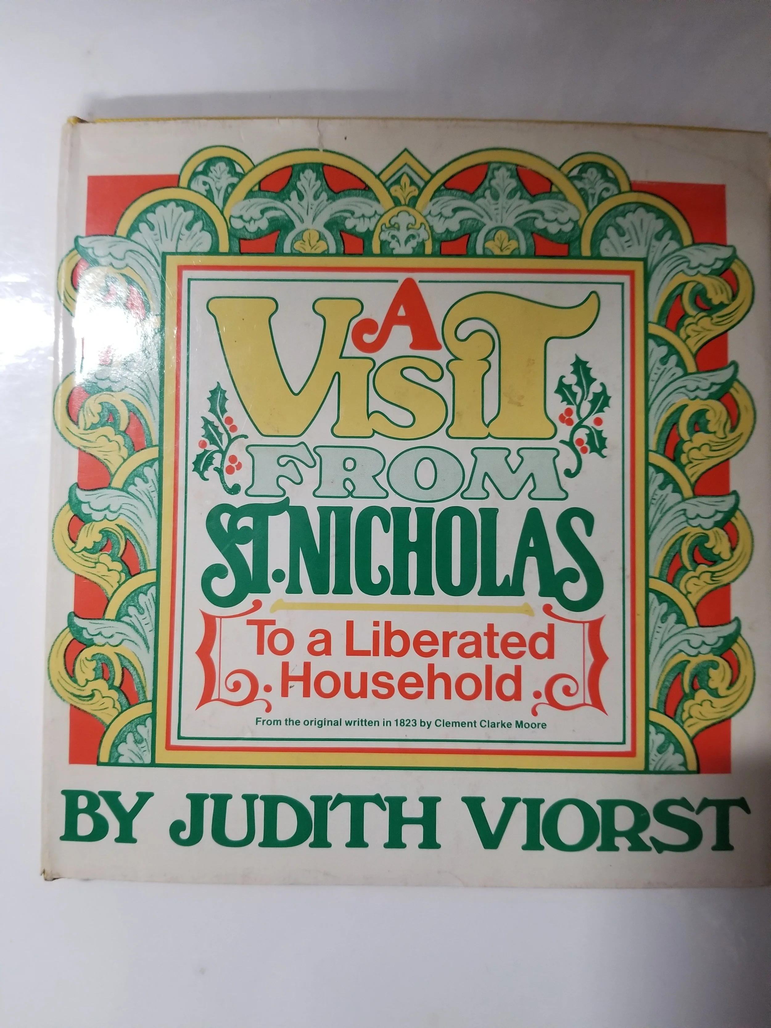 Judith Viorst. Simon & Schuster, NY 1977. Isbn:671228684 VG/G: DJ is intact, but is price clipped on inner front flap, has tears at folds and top edge and a stain on the lower rear spine Minor wear at spine end & bottom corners, Prev owner dedication in red ink on first decorated page. A cute retelling of the arrival of St Nick to a household where all reject gender stereotypes written at a time where this was a very radical ideal.